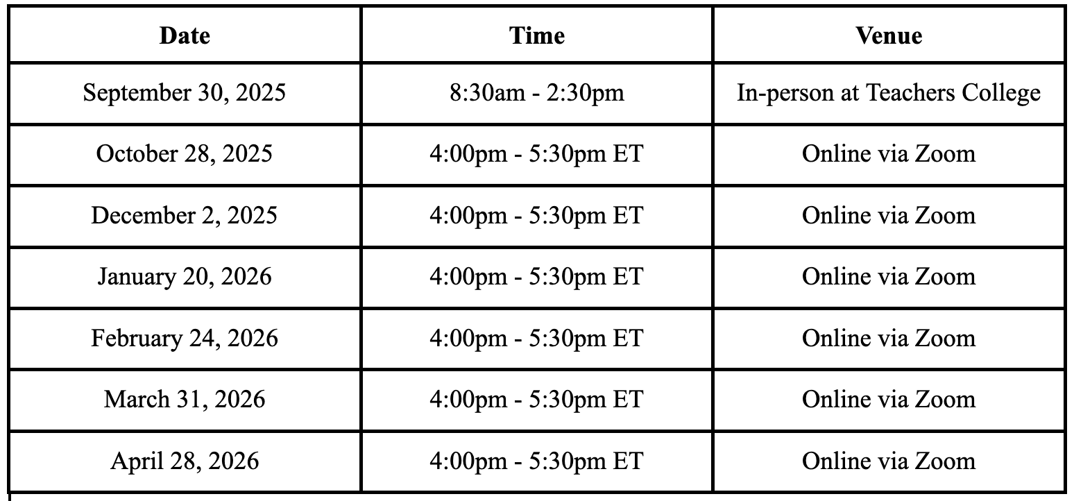 Dates: This study group for new teachers will meet across the year on 7 different days. We’ll start with an in-person day at Teachers College (on 9/30/25), and follow up with 6 virtual afterschool sessions.